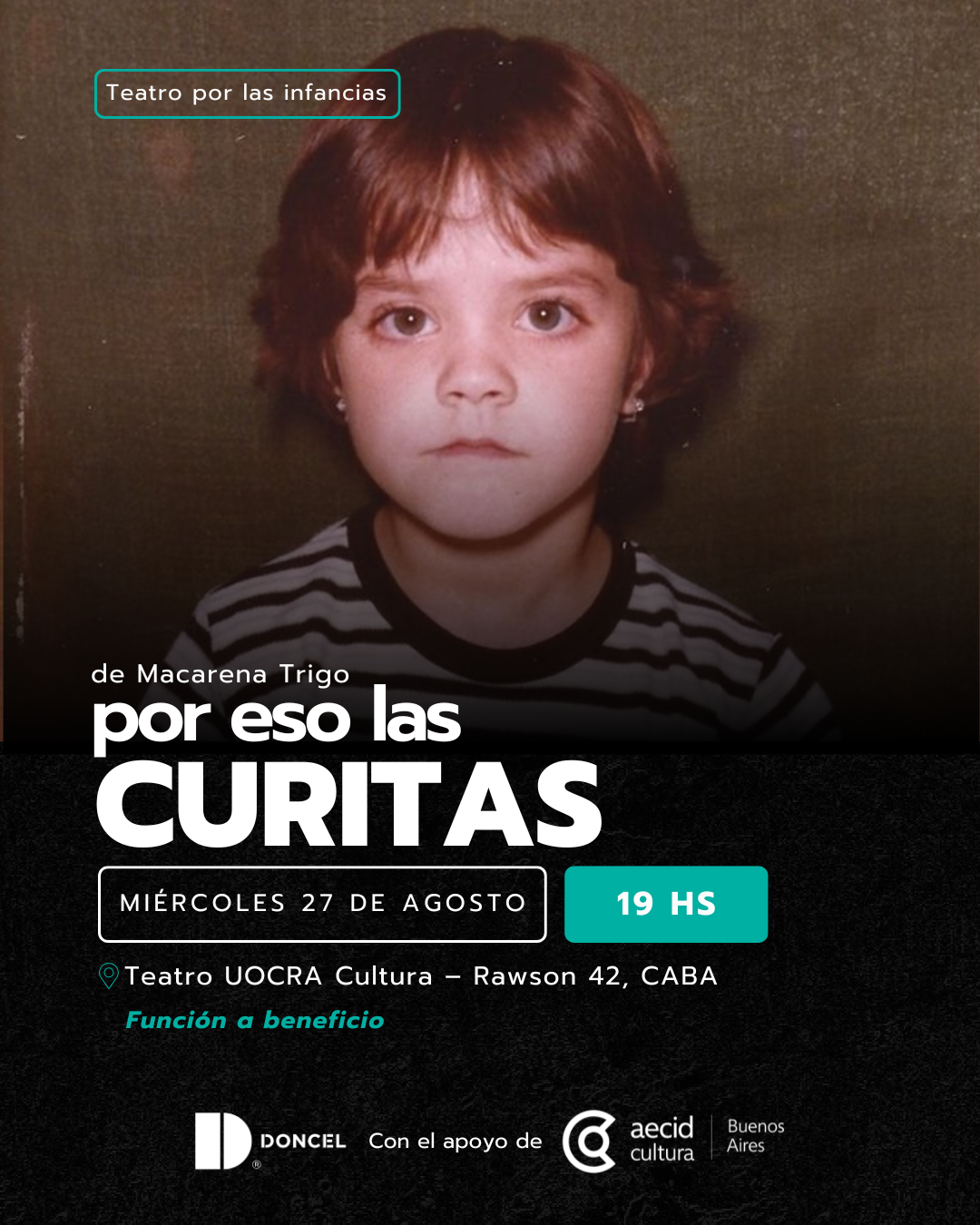 En el Mes de las Infancias, Doncel invita a la función a beneficio de «Por eso las curitas», el biodrama de Macarena Trigo, actriz, directora y egresada del sistema de cuidados español